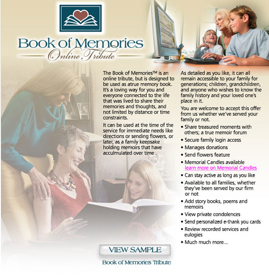 The pinnacle of memorialization, any family member or friends can take advantage of this free services by creating an account and a book to memorialize their loved one.